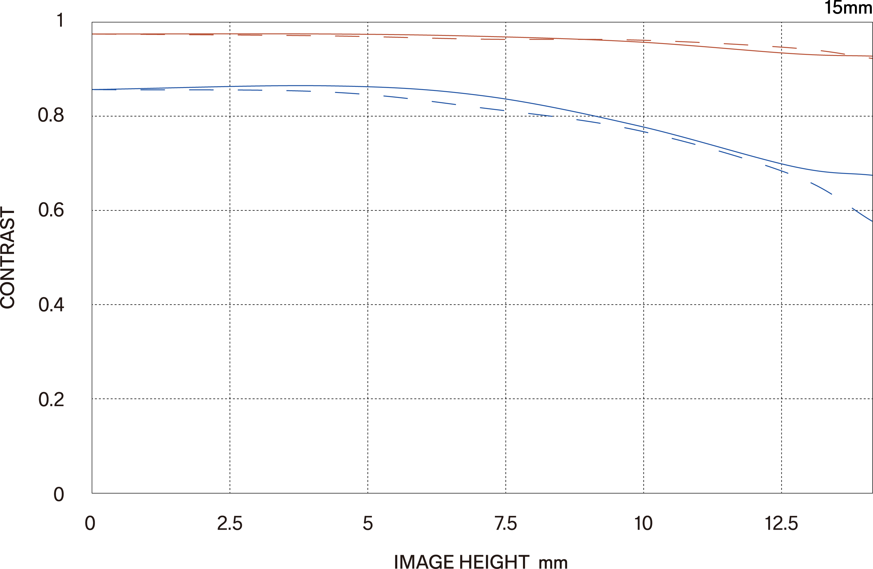 The MTF (Modulation Transfer Function) is one of the measurements for evaluating a lens’ performance, and it shows how faithfully the contrast of the subject can be reproduced on the image plane. The horizontal axis shows the image height (distance from the center of the image in mm) and the vertical axis shows the contrast value (maximum value is 1).